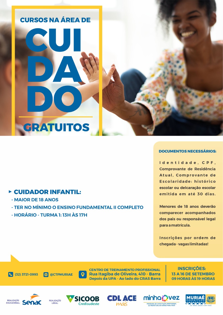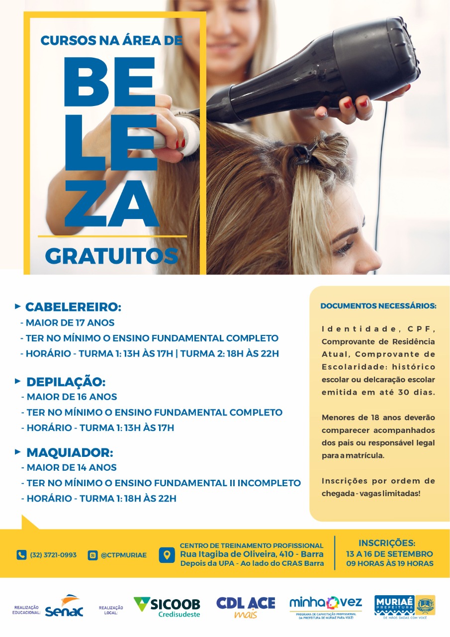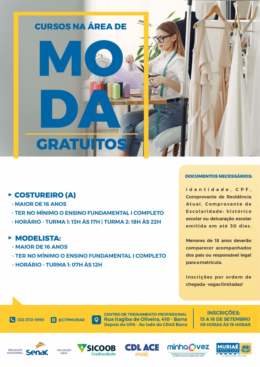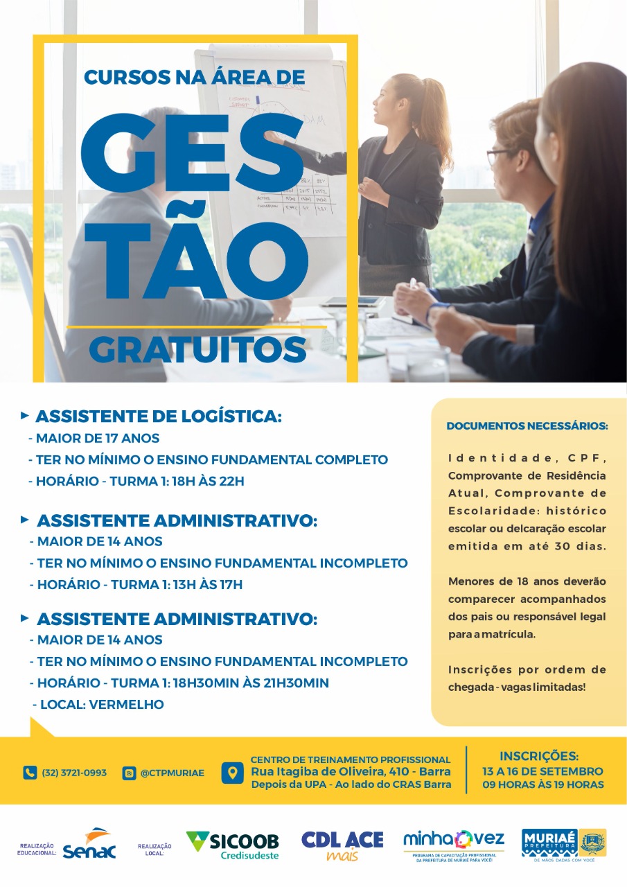 Os cursos são oferecidos através do programa Minha Vez, desenvolvido pela Prefeitura de Muriaé em parceria com Senac, Sicoob Credisudeste e CDL/ACE Mais.